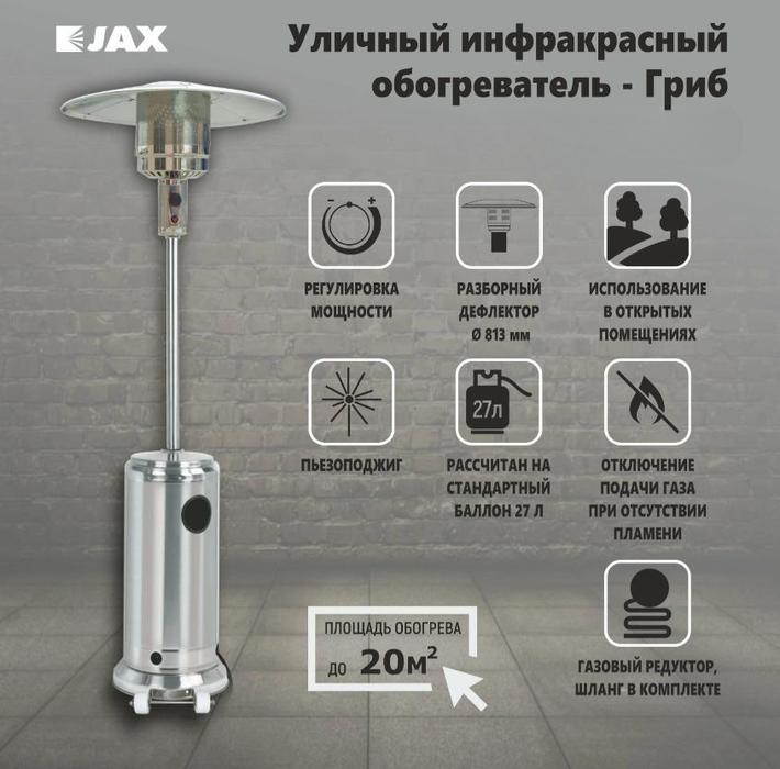 Газовые уличные обогреватели бренда Jax обеспечивают нагрев открытых площадок: террас, дачных веранд и беседок. Эффективные показатели работы достигаются за счет высокой мощности оборудования. Отличительной чертой приборов является наличие нескольких систем безопасности: излучатели прекращают работу при опрокидывании или отсутствии подачи газа.