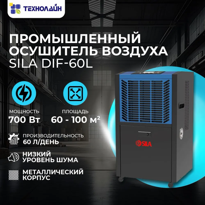 SILA (Сила) DIF-60L – это промышленный осушитель воздуха с однофазным электрическим подключением и напольным типом установки. Корпус осушителя сделан из металла с черным порошковым покрытием. Производительности 60 л/сутки достаточно для обслуживания помещений размером до 100 квадратов. Есть функции таймера и самодиагностики.