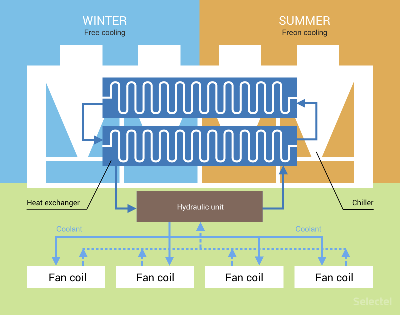 - Естественное охлаждение возможно только зимой, когда хладоноситель не нуждается в принудительном доохлаждении.